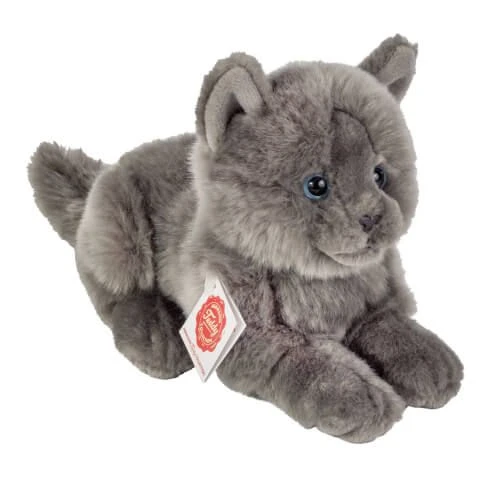 Kartäuser Katze liegend 20 cm aus der Teddy Hermann® Collection aus hochwertigem Plüsch gefertigt und mit weicher Polyesterwatte gefüllt.